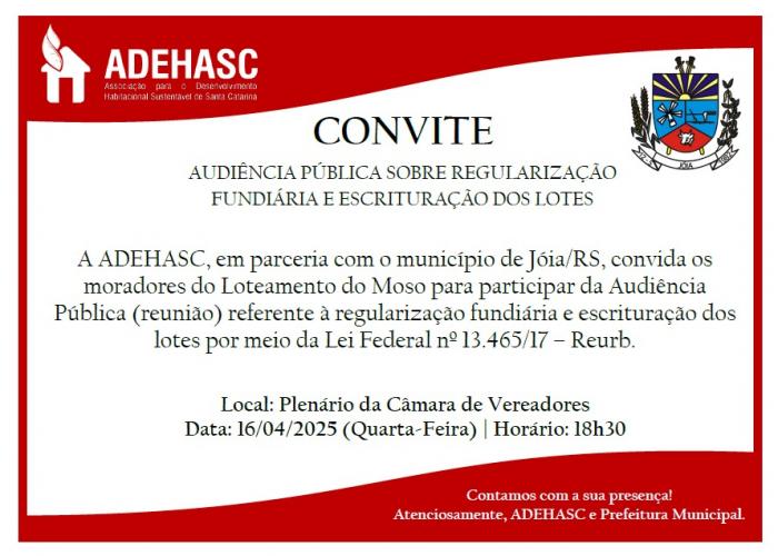 Acontece dia 16 de abril, às 18:30 horas, na Câmara de Vereadores, Audiência Pública para tratar sobre a legalização dos terrenos situados no loteamento do "Moso".