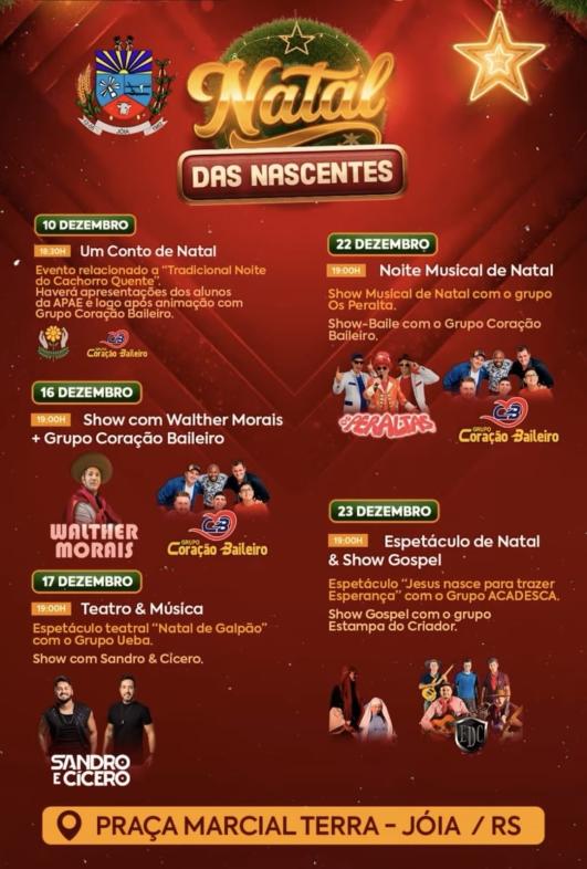 A Prefeitura de Jóia realiza várias atividades na programação do Natal das Nascentes 2025, que neste ano contará com uma série de apresentações culturais, musicais e artísticas abertas à comunidade.Os eventos ocorrerão entre os dias 10 e 23 de dezembro, sempre na Praça Marcial Terra, reunindo talentos locais, grupos tradicionais e atrações regionais.