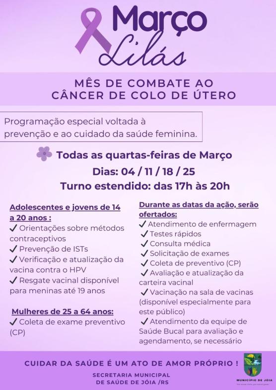A Secretaria Municipal de Saúde de Jóia realiza, ao longo do mês de março, uma programação especial em alusão ao Março Lilás, campanha dedicada à conscientização e ao combate ao câncer de colo de útero. A iniciativa tem como objetivo ampliar o acesso aos serviços de saúde e reforçar a importância da prevenção e do diagnóstico precoce.
