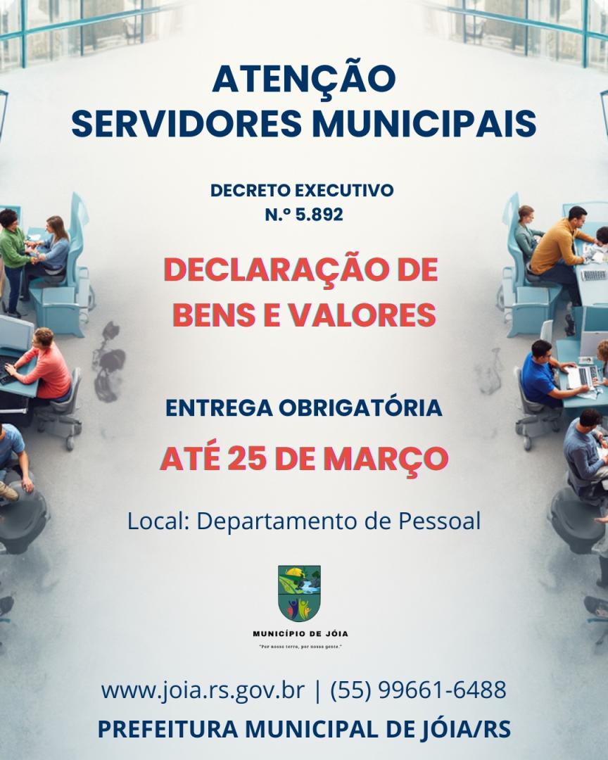 A Administração Municipal reforça que a entrega da declaração é obrigatória para todos os servidores municipais e deve ser realizada dentro do prazo estabelecido. Servidores que tiverem dúvidas sobre o preenchimento do formulário ou sobre o procedimento de entrega podem procurar o Departamento Pessoal da Prefeitura durante o horário de expediente. As guias podem ser encontradas em anexo, no site da prefeitura: www.joia.rs.gov.br